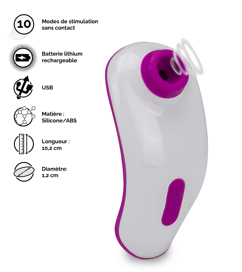 En appliquant son bec en silicone sur votre clitoris, vous profiterez de délicieuses sensations inédites ! Sans toucher directement votre clitoris, ce sextoy alterne entre des pulsations d’air, des aspirations et vibrations pour des sensations inoubliables ! Pour s’adapter à toutes envies, des plus tendres aux plus intenses, votre stimulateur vous offre le choix parmi 10 modes d’intensité. Petit et léger, il vous suivra partout où vous le désirerez pour des moments orgasmiques en sa compagnie. Vous pourrez le recharger très simplement grâce à son câble USB magnétique fourni. Le stimulateur de clitoris sans contact Addie mesure 10,2 cm de longueur et 4,8 cm de large. Le petit bec en silicone a un diamètre de 1,2 cm.