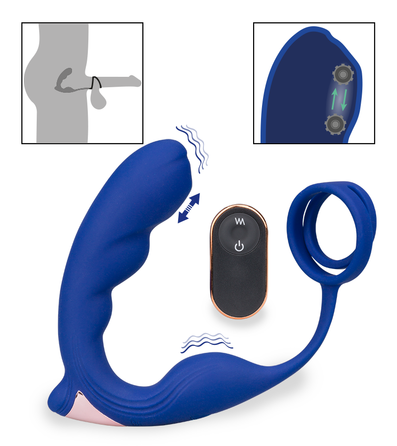 Ce sextoy ultra complet vous donnera accès à des orgasmes explosifs. La partie insérable est courbée et diffuse des vibrations, elle possède également sur sa tête une petite bille qui se déplace de haut en bas pour stimuler la prostate très localement. A la base du sextoy, un autre moteur a été installé, il fera vibrer votre périnée pour un plaisir total. 9 modes vibrants sont disponibles et contrôlables avec la télécommande sans fil fournie. Vous trouverez également à l’autre extrémité du sextoy deux anneaux cockring à placer derrière les testicules et autour du pénis. Ces anneaux effectueront une pression sur votre intimité qui aura pour but de durcir votre érection et de repousser votre orgasme tout en l’intensifiant. Que vous décidiez d’utiliser ce stimulateur en solo lors de la masturbation ou à plusieurs lors d’un rapport sexuel, vous serez surpris de l’effet qu’il aura sur vous et vous n’aurez qu’une envie : recommencer.