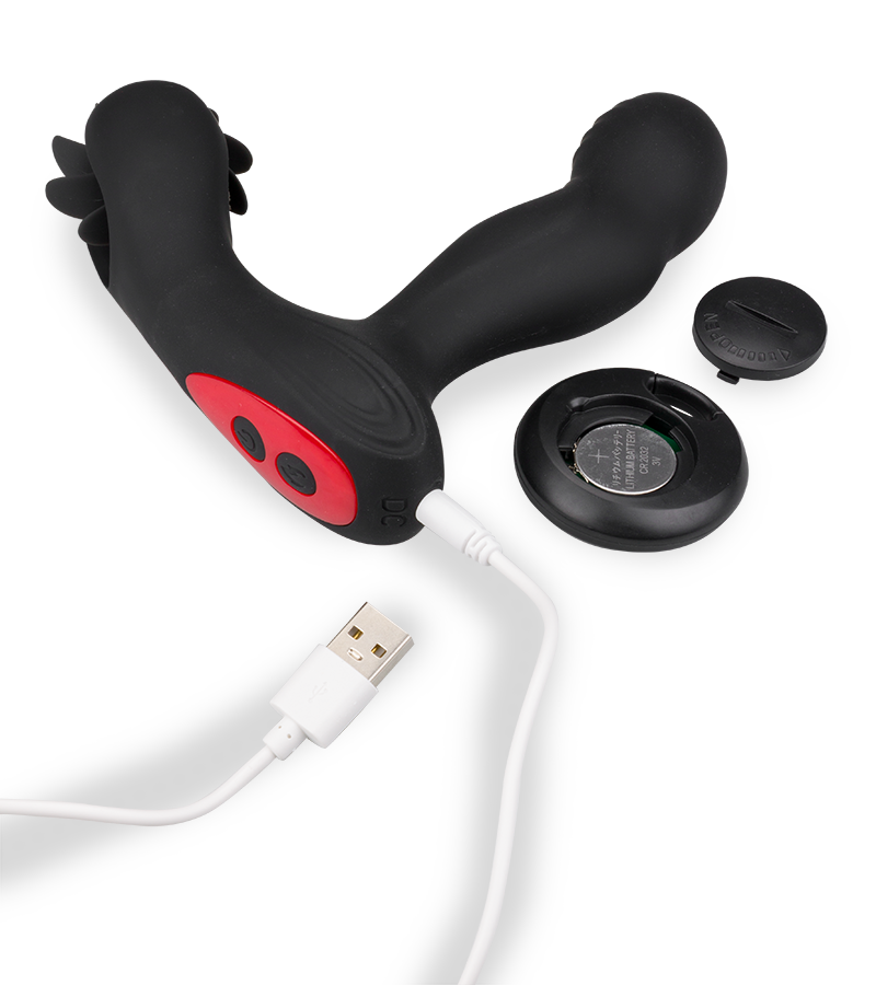 Le stimulateur de prostate et périnée chauffant Marvin se charge avec son câble USB magnétique fourni. La télécommande sans fil fonctionne avec une pile bouton 3V fournie.