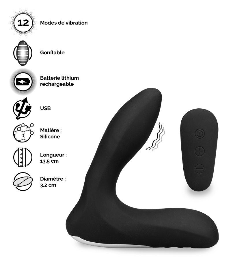 Ce sextoy est entièrement pensé pour le plaisir masculin et l’atteinte de l’orgasme prostatique grâce à la stimulation intense du point P. Il s’agit d’un objet tout simplement parfait pour découvrir ou redécouvrir des sensations exceptionnelles, notamment grâce à ses 12 modes de vibration et au fait qu’il soit gonflable. Le stimulateur prostatique vibrant et gonflable mesure 13,5 cm au total pour un diamètre de 3,2 cm. Il est accompagné d’une télécommande sans fil et le sextoy comme cette dernière peuvent être rechargés grâce à un câble USB inclus.
