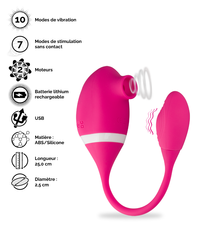 Ce sextoy pour femme est l’un des plus efficaces du marché et vous emmènera à des orgasmes époustouflants. Son embout viendra vous masser sans jamais toucher directement votre clitoris grâce à des pulsations d’air. Vous pourrez également insérer l’œuf dans votre intimité pour un massage vibrant de votre point G. Cette double stimulation est redoutable et ne vous laissera aucune chance de vous en tirer sans un orgasme, minimum !