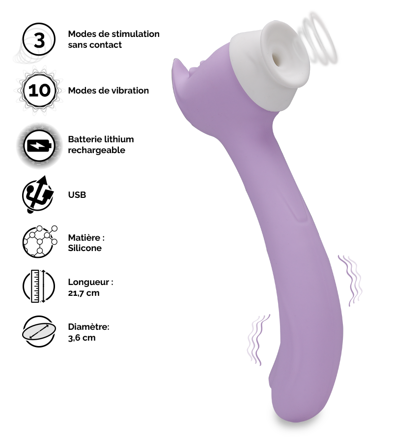 Vous pourrez également l’utiliser en stimulation externe en venant appliquer son bec sur votre clitoris et ainsi profiter de la stimulation sans contact et des 3 intensités disponibles.