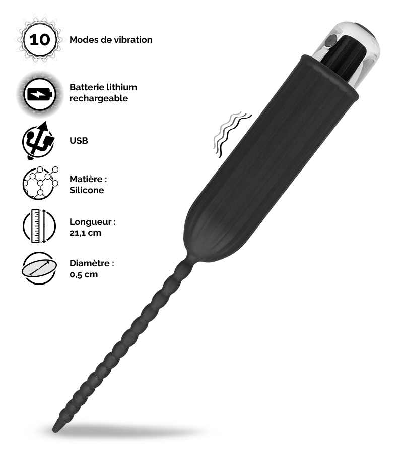 D’une matière douce et souple, cette tige s’insèrera en douceur dans votre urètre avant de déclencher des vibrations. Idéale pour les personnes appréciant les jeux de sonde, elle permet de découvrir une toute nouvelle panoplie de plaisirs grâce à ses 10 modes de vibrations. En variant de cadence et d’intensité, elle vous surprendra à chaque instant. Son diamètre irrégulier en vagues répercutera chacun de vos mouvements pour vous amener à un orgasme fulgurant. De plus, en retirant la bullet vibrante de la gaine en silicone vous pourrez l’utiliser pour stimuler toutes les zones érogènes de votre corps, ou celles de votre partenaire…