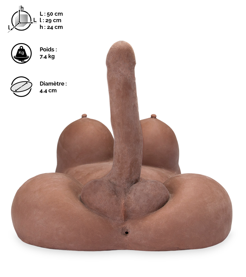 Ce buste permet de se faire plaisir de nombreuses manières, que l’on soit un homme ou une femme. C’est un sextoy en TPE à partager en couple. L’homme pourra se ravir de la poitrine opulente ainsi que de son anus ouvert à toutes les pénétrations profondes de 13,0 cm, tandis-que la femme peut user de son gode à la longueur généreuse pour se faire pénétrer. Une double pénétration lors d’un usage en couple est même envisageable. Grâce à son réalisme exacerbé, ce pénis avec veines, testicules et gland en relief procurera des sensations intenses lors des allers-retours dans votre orifice, qu’il soit anal ou vaginal. Le sextoy pèse 8,0 kg. Sa longueur est de 60,0 cm, sa largeur de 31,0 cm, sa hauteur de 29,0 cm, son tour de poitrine de 70,0 cm, son dessous de poitrine de 52,0 cm, son tour de taille de 42,0 cm et son tour de hanches est de 75,0 cm. Son anus est profond de 13,0 cm et son gode mesure 19,0 cm de long.