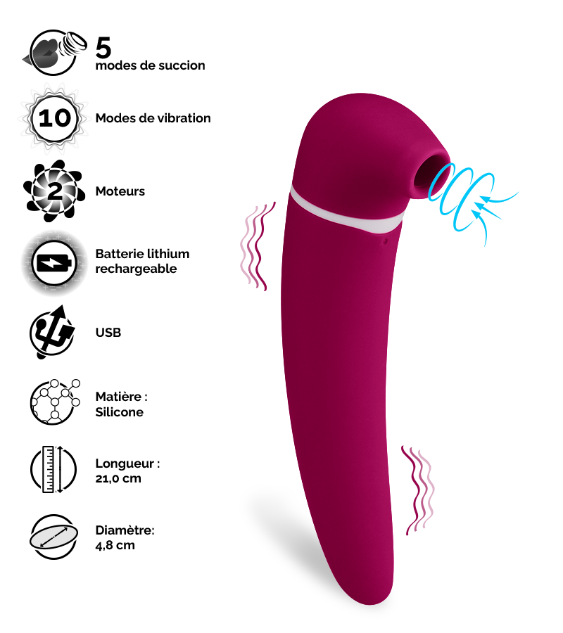Ce sextoy 100% féminin a 3 fonctionnalités. C’est un aspire-clitoris et un stimulateur vibrant clitoridien. De plus, le manche est vibrant, pour pourvoir l’utiliser en pénétration vaginale. Tous les axes du plaisir féminin sont exploités en un seul et même sextoy. Sa couleur sera parfaite pour compléter votre collection de jouets coquins. Sa forme, légèrement courbée, est idéale pour stimuler le point G. 10 modes de vibration s’offrent à vous pour trouver ce qui vous fera vibrer de plaisir. Ce sextoy est ultra doux et son look design ne laisse pas la place à la vulgarité. Il mesure 21,8 cm de long, 6,8 cm de large. L’aspire clitoris fait 2,7 cm de diamètre tandis que le manche fait 5,2 cm de diamètre. La longueur insérable est de 17,6 cm.