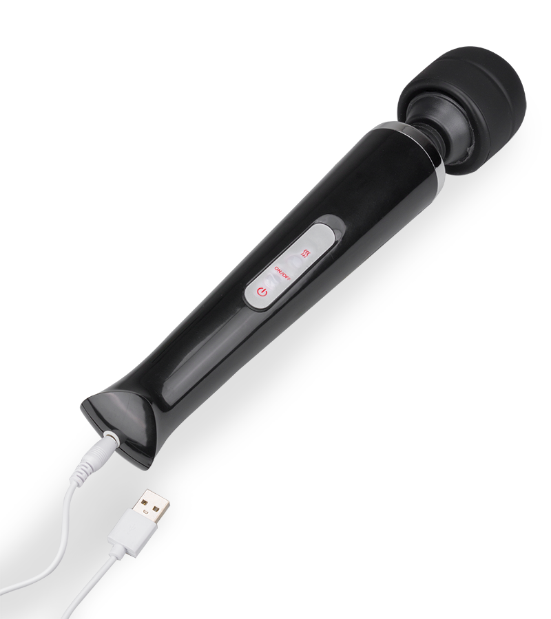 Le vibromasseur mesure 32,0 cm de long. Sa tête possède un diamètre de 5,8 cm. Il fonctionne sur batterie rechargeable avec le câble USB fourni.