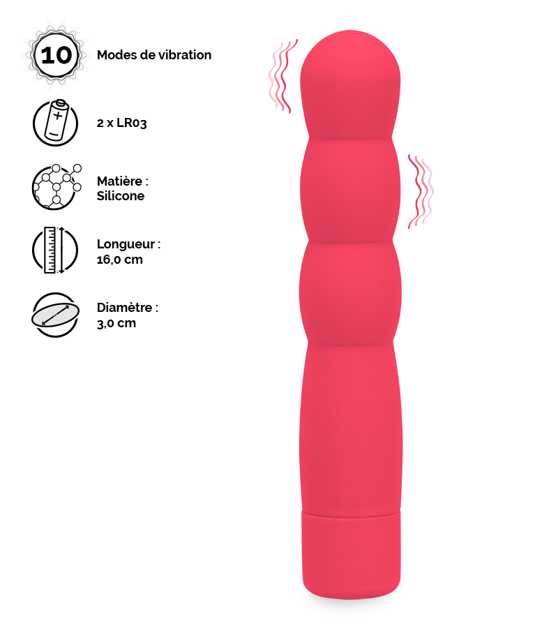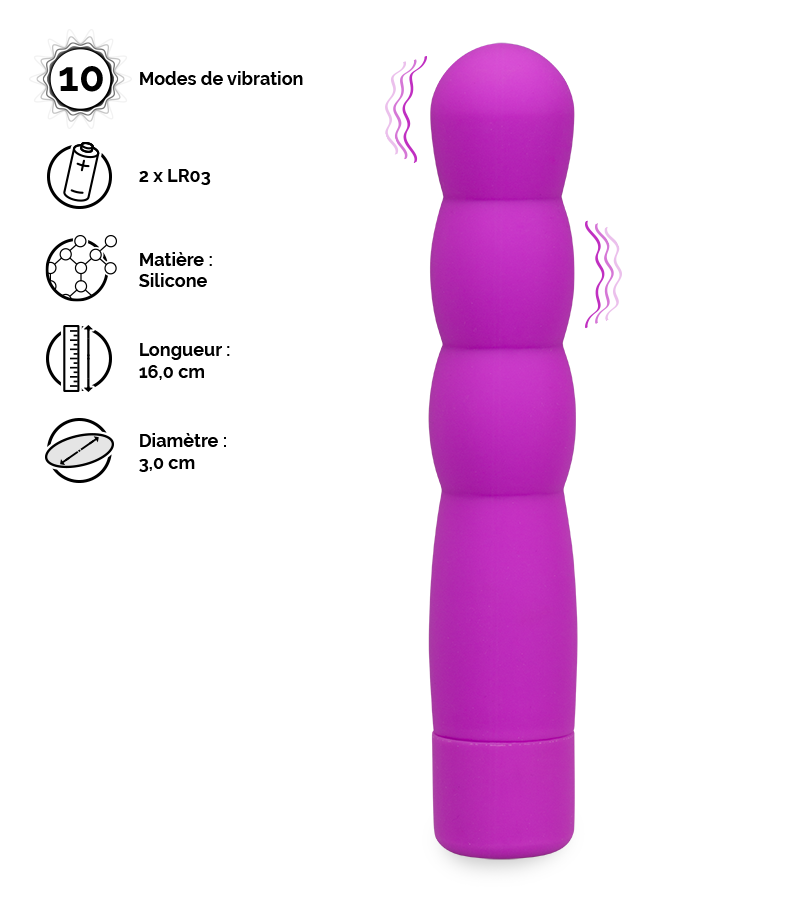 Ses ondulations et sa matière toute douce vous feront profiter d’un massage sensuel de votre intimité au rythme du mode choisi parmi les 10 modes de vibrations proposés.