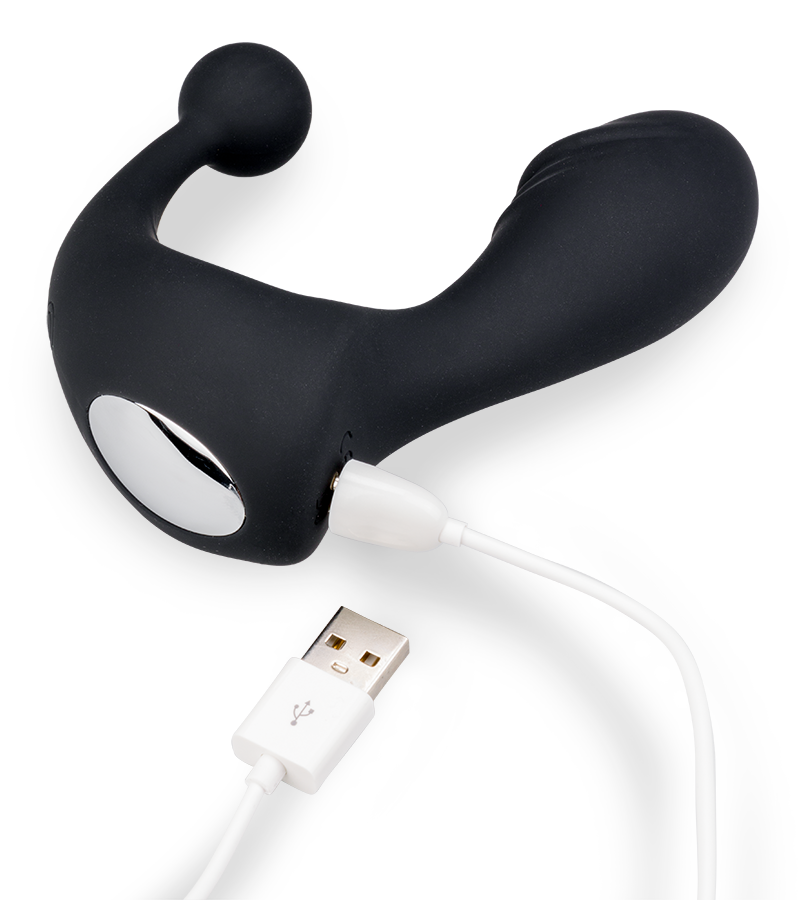 1 – Avant utilisation, chargez le masseur prostate durant 2h environ. Le câble se branche sur les deux ports métalliques situés entre le logo « DC » et « CE ».