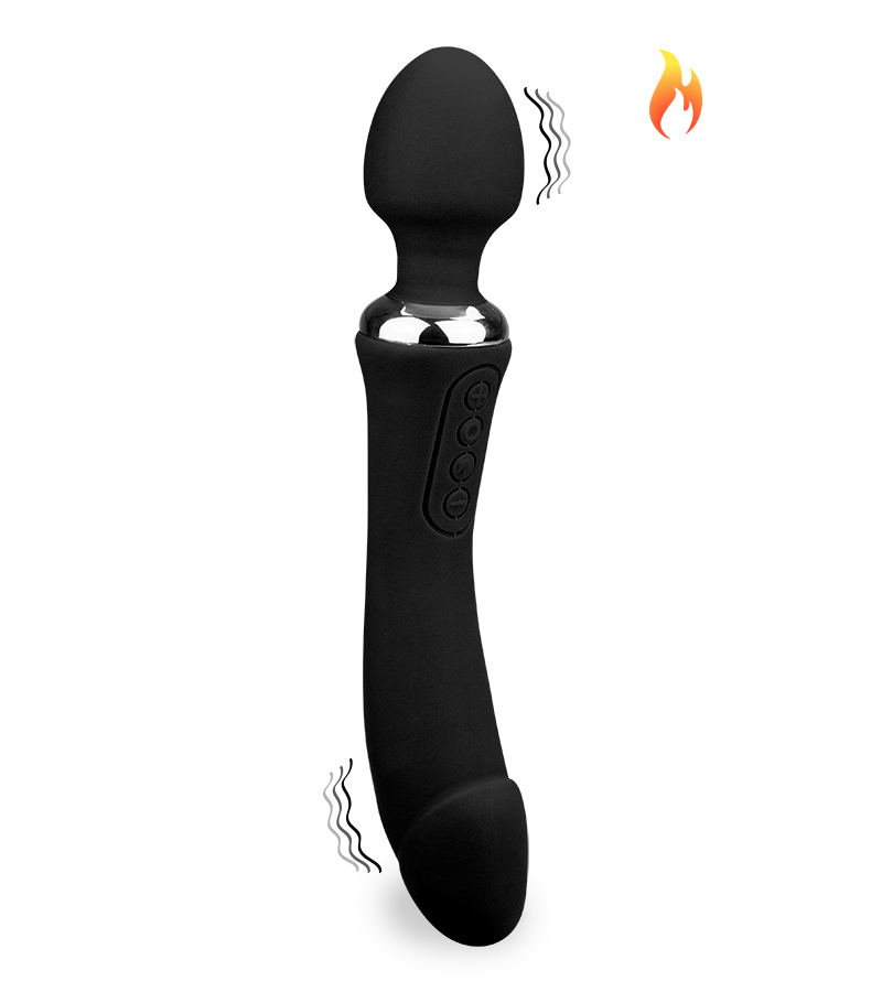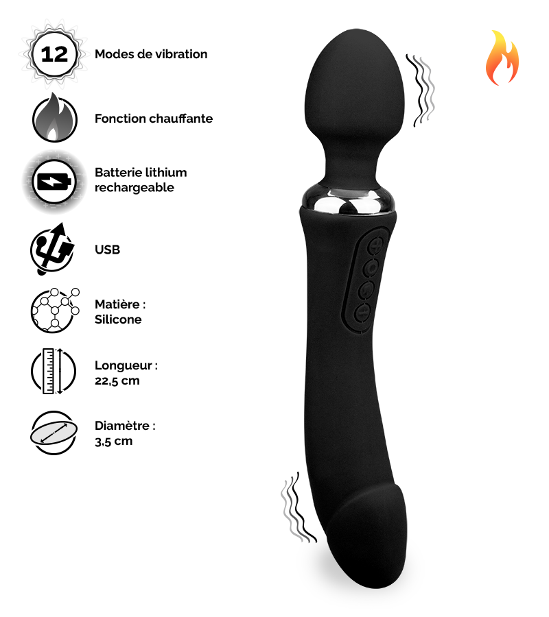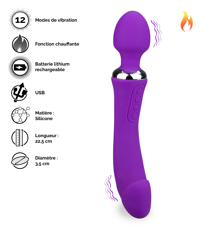 Plutôt que d’avoir deux sextoys, celui-ci vous permet de profiter des avantages d’un vibromasseur et d’un wand, le tout dans un seul jouet ! Vous n’aurez qu’à le retourner pour profiter de l’une ou de l’autre fonctionnalité. Sa partie insérable massera votre point G grâce à sa forme courbée, à ses détails réalistes en relief et à ses 12 modes de vibration. Pour plus de confort, cette partie comprend également une fonction chauffante. La partie wand, avec sa tête vibrante, viendra stimuler votre vulve et plus précisément votre clitoris au rythme du mode de vibrations choisi.